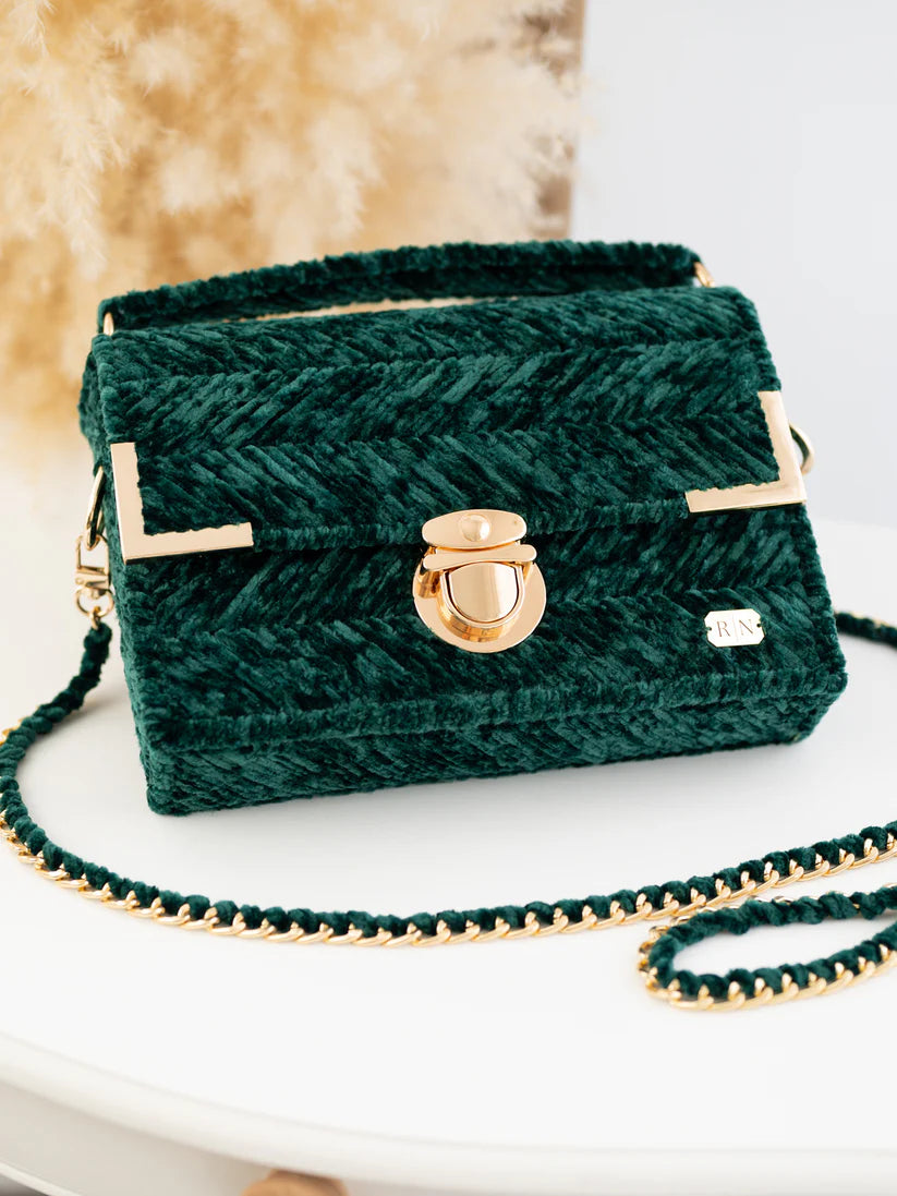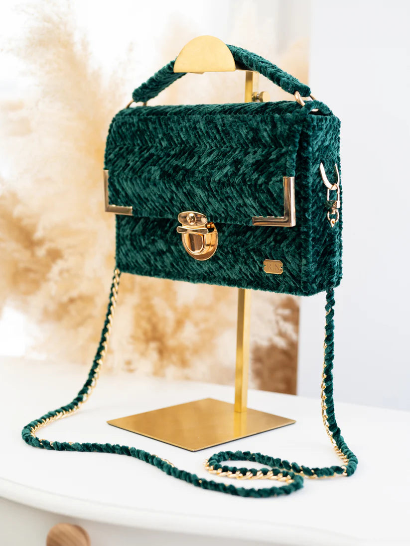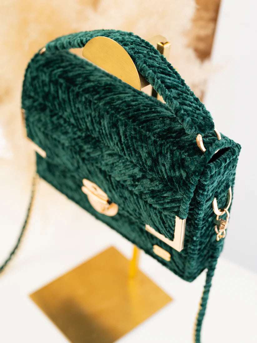 The vintage charm of MICAH's forest green velvet bag is accented with luxurious gold accessories, making