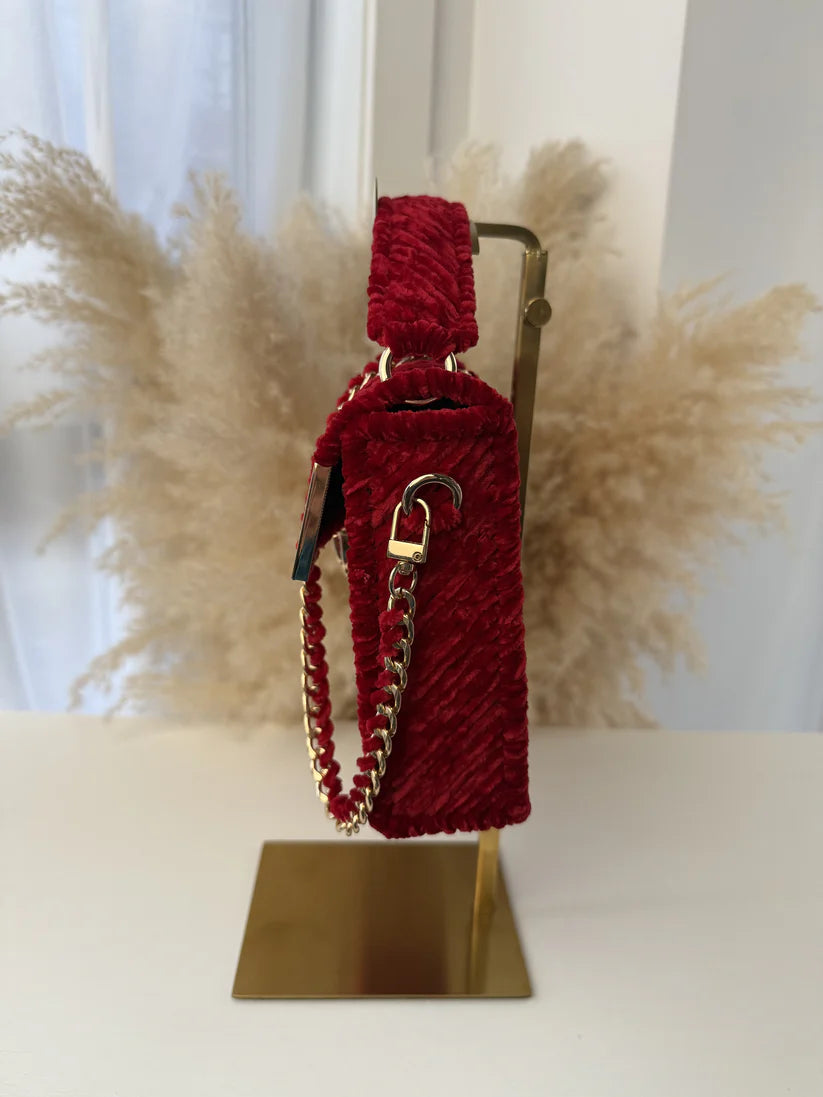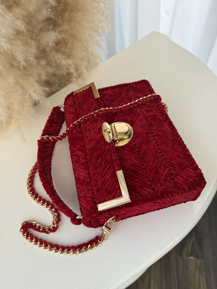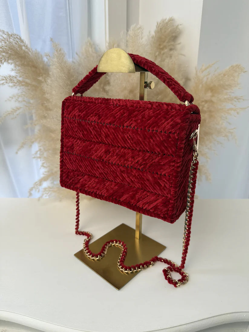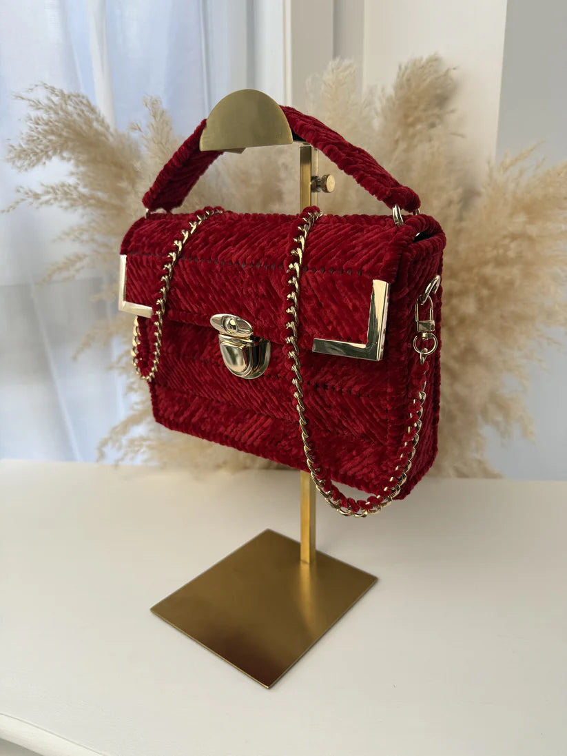 The vintage charm of MICAH's forest green velvet bag is accented with luxurious gold accessories, making